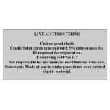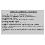 TERMS; CHARGING 10% BUYER'S PREMIUM.. ITEMS CAN BE PAID PRIOR TO PICKING UP, OR WHEN PICKED UP. ALL ITEMS MUST BE PAID IN FULL BEFORE PICKING UP. PAYMENTS ACCEPTED ARE CASH, CHECK, VISA, MASTERCARD, & DISCOVER.