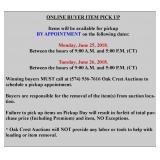 A 3% CHARGE WILL BE ADDED IF A DEBIT OR CREDIT CARD IS USED. THE CREDIT CARD YOU HAVE ON FILE WILL BE CHARGED FOR YOUR PURCHASE AUTOMATICALLY IF YOU DO NOT PICK UP AT THE DESIGNATED TIME & A $10.00 HANDLING FEE WILL BE ADDED. READ MORE****** A $10.00 HANDLING FEE WILL BE CHARGED ON ANY ITEMS NOT PICKED UP BY DEADLINE OR THAT WE HAVE TO BRING BACK TO OFFICE. +++ ABSOLUTELY NO LARGE ITEMS WILL BE HAULED BYAUCTION COMPANY +++ ALL ITEMS ARE SOLD ON AN "AS IS,WHERE IS" BASIS. ALL DESCRIPTIONS ARE BELIEVED TO BE ACCURATE, BUT NOT WARANTEED. AUCTION COMPANY RESERVES THE RIGHT TO REJECT ANY BID AT THEIR SOLE DISCRETION. UNLESS OTHER ARRANGEMENTS HAVE BEEN MADE. IF OTHER ARRANGEMENTS ARE MADE FOR ITEM PICKUP A $10.00 CONVENIENCE FEE WILL BE CHARGED. ABSOLUTELY NO LARGE ITEMS WILL BE HAULED BY AUCTION COMPANY. ALL ITEMS NOT PICKED UP WITHIN 10 DAYS WILL BE RESOLD. BRING HELP TO LOAD!!!!!!!! IF YOU HAVE ANY QUESTIONS, FEEL FREE TO CALL THE AUCTION COMPANY. WE WILL DO OUR BEST TO ANSWER ALL OF YOUR QUESTIONS. (217) 342-4500 |