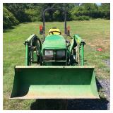 DOWNSIZING ESTATE AUCTION SATURDAY JUNE 23RD @ 10:00 2308 HWY 375 WEST- MENA, AR See PHOTOS @ www.huntersauctionservice.com DIRECTIONS: Take Hwy 71 So to the last stop light in Mena, turn right onto Hwy 8 west then turn Left onto Hwy 375 and go 1/2 mile- auction is on the left: Watch for signs! TRACTOR- IMPLEMENTS- 4 WHEELER: John Deere 4010 HST tractor( 320 hours) with four-wheel drive, 410 front loader- 54 in belly mower- Frontier RT 1150 three point hitch PTO tiller- Kawasaki Prairie 360 4 wheeler- 42 in Craftsman 17.5 hp riding mower- 4ft by 4ft dog box trailer- Craftsman 17 in heavy-duty rear tine tiller- HOUSEHOLD: Sentry Safe- sewing machines- fireplace sets- Lonestar acoustic guitar- mirrors- croquet set- Rainbow vacuum cleaner with several attachments- sharp cordless vac- Emerson microwave- Hoover SteamVac- Wood TV trays- glass fruit- cow skull with long horns- CorningWare -