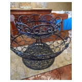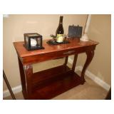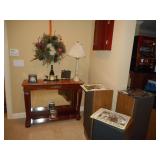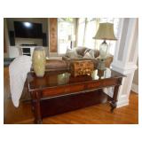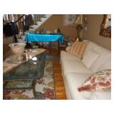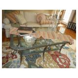 Game room furniture including fabric couch, coffee table, console tables, iron bakers rack
