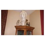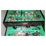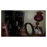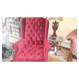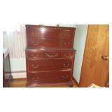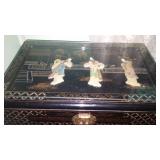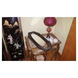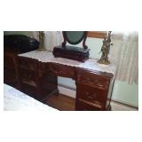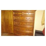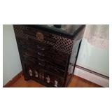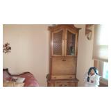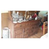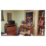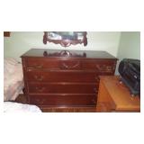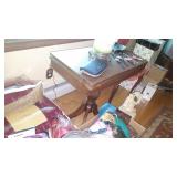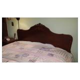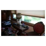 · FURNITURE — Victorian Style Sofa (needs re-upholstering), electric fireplace, antique game table, curio cabinets, end tables, glass coffee table, glass stand, plant stands, dining room table and 6 chairs and matching breakfront, wooden kitchen table and 4 chairs, cherry bedroom set with queen bed, dresser and chest of drawers, mahogany bedroom set with double bed, dresser with mirror, chest, vanity, night stand, walnut bedroom set with double bed, dresser with mirror, chest of drawers, oriental black lacquer silver chest, bookcases, small desk, stands and odd chairs.