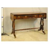 4.Inlaid mahogany narrow drop leaf sofa table; 68-488 - trestle base with lyre pedestals - brass toe caps and casters - banded top - 44.5x14x29