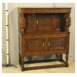 9.Small carved oak blind door china cabinet; 68-467 - stretcher base - turned columns and legs - 41x17x50