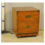 13.Bernhardt oak campaign style 2 drawer night stand on casters; 68-458 - 18x18x22.5