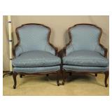 32.Pair of carved mahogany French style arm chairs with down cushions; 68-529 - blue upholstery - 27x26x34.5