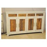 43.Distressed white credenza with carved natural doors; 52-670 - 4 drawers over 4 doors - 67x16x40