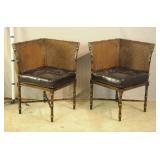 52.Pair of cane cut corner chairs with tufted leather cushions; 68-509 - caned seat and back - x stretcher base - 23x23x34