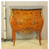 53.Bronze mounted burl walnut French Bombe style chest with marble top; 68-485 - 3 over 1 drawer - serpentine front and sides - 33x18x35