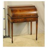 59.Hekman mahogany cylinder roll top desk; 68-476 - spade feet - green leather slide-out writing board - 32x20.5x39