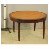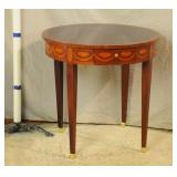 71.Baker inlaid round mahogany side table with banded top; 68-478 - tapered legs with brass toe caps - 2 drawers and 2 pull-out slides - 25.5x25.5x25
