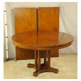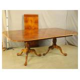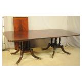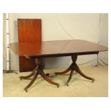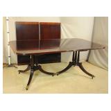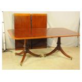 75.Banded mahogany double pedestal dining table with 2 leaves; 68-526 - carved floral pedestals with reeded columns - brass toe caps and casters - 45.5x123x30 extended; 23.5" leaves