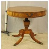 15.Crotch mahogany round scalloped edge lamp table with drawer; 68-536 - single 4 leg pedestal with brass toe caps and casters - banded top - light finish - 34x34x28