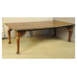44.Ethan Allen inlaid crotch mahogany coffee table with banded top; 68-481 - 4 leg pedestal base with brass toe caps - 48x30x19