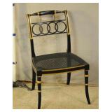 332.Black and gold accent chair with caned seat; 109-162 - cane cut front legs - (1 small break in cane; stains on cushion) - 21x22.5x33