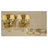 364.Pair of ornate metal 2 light electric wall sconces; 868-105 - includes matching bathroom accessories - 12x6x17.5 sconces