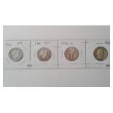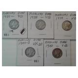 559 MERCURY DIMES 1937, 1938, 1939, 1940, 1940-D MERCURY DIMES, VG-F.