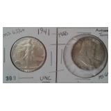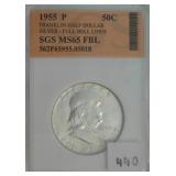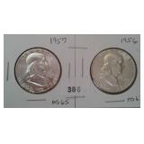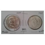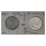 555 WALKING &FRANKLIN HALF DOLLARS 1946-S WALKING HALF DOLLAR, F. 1955 FRANKLIN HALF DOLLAR, BU, MS.
