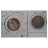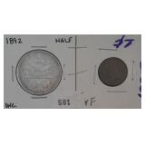 581 HALF DOLLAR & INDIAN CENT 1892 COLUMBIAN EXPOSITION HALF DOLLAR, AU. 1905 INDIAN CENT, VF.