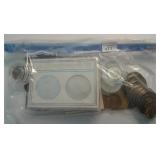 266 CHARMS, FOREIGN COINS, ETC. BOX OF CHARMS, 4-LEAF CLOVER (GOLD/ELECTROPLATED), MISC. CHARMS, FOREIGN COINS.
