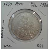 521 SILVER 1930 PERU, 1-SOL, SILVER, UNC.