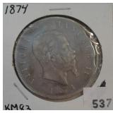 537 LIRAS 1874 ITALIAN VICTOR EMANUEL II LIRA 5, .900