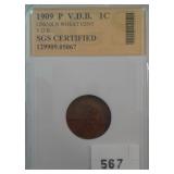 567 VDB CENT 1909 VDB CENT, SGS CERTIFIED, VG.