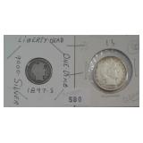 580 BARBER DIME & QUARTER 1897-S BARBER DIME (BETTER DATE), G. 1908 BARBER QUARTER (CLEANED), XF.
