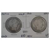 586 BARBER HALF DOLLARS 1907-O, 1910 BARBER HALF DOLLARS, VG, G-VG. (1910 LOW MINTAGE)