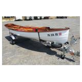 WITH OARS AND HONDA OUTBOARD 2 HP 4-CYCLE MOTOR MODEL BF2D. BOAT IS 15' LONG BY 42" WIDE. CARRYING CAPACITY 450 LB. BOAT WEIGHT 100 LBS. SELLS WITH TITLED TRAILER. VERY NICE CRAFTSMANSHIP. EVERYTHING IS IN MINT CONDITION. COMES WITH COVER. BOAT AND TRAILER ARE TITLED.