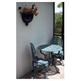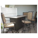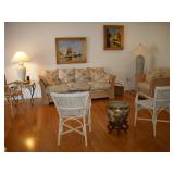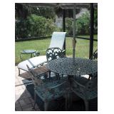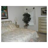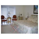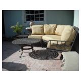 Furniture 6 pc. Drexel bedroom suite with king headboard 2017 king mattress and boxspring Cast iron patio set: curved couch, coffee and side tables and bar with 4 barstools Cast iron patio table with 4 chairs, umbrella, cast iron bench ; cast iron table-for-two with two chairs; chaise and side table Tall curio cabinet full of cut and pressed glass, cobalt glass; also California Cloisonne Mahogany and other ide tables; modern metal and glass side table Mediterranean dining room set: large table with 2 leaves; 4 cane-back chairs, buffet and china cabinet 2-piece mahogany secretary/bookcase Rattan lanai furniture: sofa and chair, assorted rattan side chairs 4 barstools Sofa Mid-Century Modern coffee table with marble top Pair Queen Anne chairs