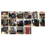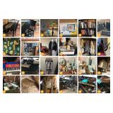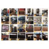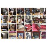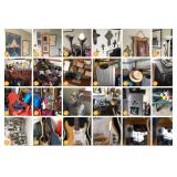 * Books * hat boxes * purses; hats, vintage clothes * costumes & dance shoes * photo enlarger & developing accessories * Adirondack chairs, plastic * lots of unique decor * women's clothes, costume jewelry, hats & furs * vintage side tables * kitchen & household misc. * seasonal, vintage candle blow molds * artwork * lawn and garden * area rugs * Tiffany style lamps * kitchen island on wheels * footboard chest * queen sleigh bed dtessers * antique mirrored vanity * rock and stone collection * linens * Chinese art * vintage pins and brooches