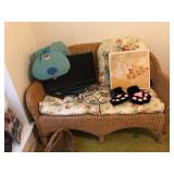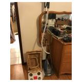 wicker settee, bedside tables, tall Shark steamer, Dyson DC 50,