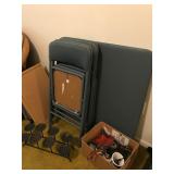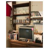 chair, VHS tapes, DVDs, laundry hamper, small entertainment center,