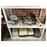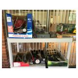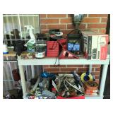 box, Craftsman chain saw, Zareba 10 mile fence charger, grinder,