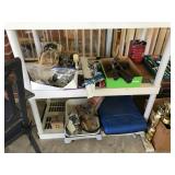 ladder, wrenches, screwdrivers, hammers, saws, wooden storage