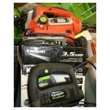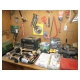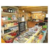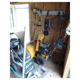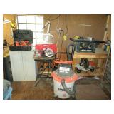 Tools and garage items: Crew Line 1500 lb. motorcycle jack, Mega Force 6500 watt generator, Keller extension ladder, Werner ladder, Powermate compressor, propane tanks, Poulan Pro 24” snow thrower, Karcher power washer, Ryobi weed wackers, hoses, Rubbermaid trash cans, Ridgid Wet/dry vac, Milwaukee sawzall, wheel barrow, Husky nail gun, 5 speed drill press, Stanley 5 drawer tool chest, Durotek stainless tool chest, Columbian work vise, Rockwell, jigsaw, B&D products incl. firestorm 5 pc. set, 10” table saw, 6” bench grinder, miter saw and jigsaw, Porter Cable nail gun, B&D workmate workbench, 150psi Porter Cable air compressor, car ramps, Coleman propane stove, propane tanks, Kawasaki jigsaw, Skil router, DeVilbiss air gun tool set, S-K socket and rachet sets, storage bins, utility sink, misc. hand tools, garden tools, hand tools, fans, pots and so many more tools and accessories!