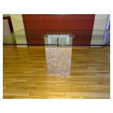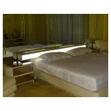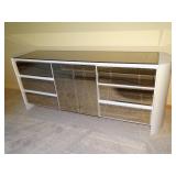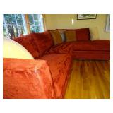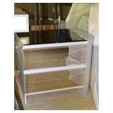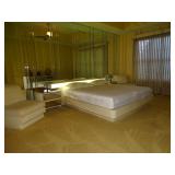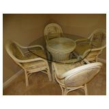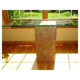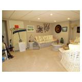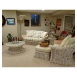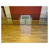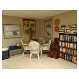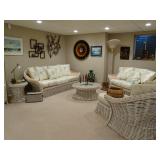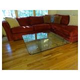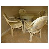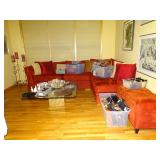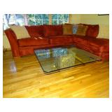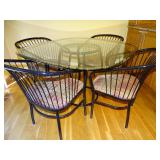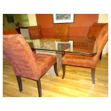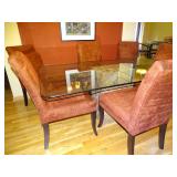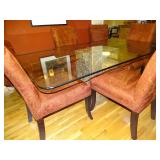 FURNITURE and HOME DECOR: Matching pedestal glass top tables for dining room, coffee table and sofa table. 6 parson chairs, sofa sectional, contemporary glass top kitchen table with 4 chairs, Bernhardt Flair dragon buffet cabinet, Ashley lounge chair, bookshelves, King size bed with matching mirror dresser and 2 nightstands, 2 Thayer Cogin slipper chairs, file cabinets, rattan glass top kitchen table with 4 chairs, rattan coffee table with matching sofa and love seat, barstools and more.