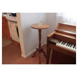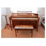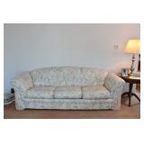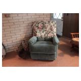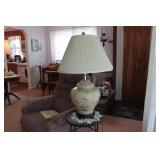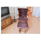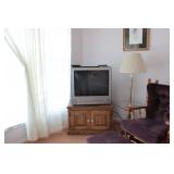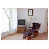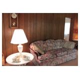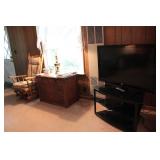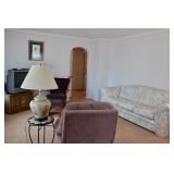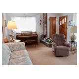 Living Room: ‘Floridian Vibes’ 3 Seat Sofa, Brass Table Lamp, Aubergene Rocker and Ottoman, Various Signed and Number Artwork Sharp VCR and TV, Oak TV Stand, Mosaic Effect Side Table, Asian Inspired Framed Collage, Converted Vintage Gas Lamp Hanging Light Fixture, Aerosonic Piano, Porcelain Floral Lamp, Pedestal Table