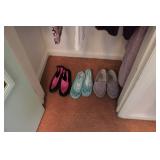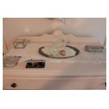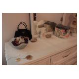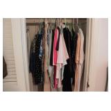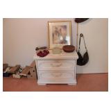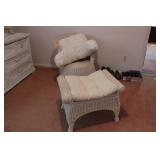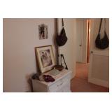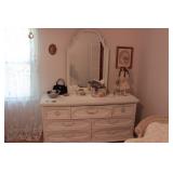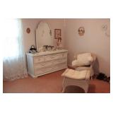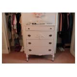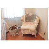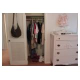 Dressing Room: Rattan Chair and Ottoman, Shabby Chic Dresser Pair, Framed Needlepoint, Vintage Clothes, and More.