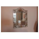 Bedroom: Mint Green Antique Farmhouse Vanity with Mirror and Nightstand,, White Wicker Armchair, Mini Floral Rug, Decor, Books, Bulova Mantel Clock, Glass Lamp, Floral Patchwork Bedding Set, Women’s Clothing and Purses,