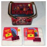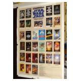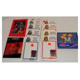 1980 TOPPS ESB UNCUT ALPHABET STICKER SHEET, SERIES I 1980 TOPPS FLATTENED GUMCARD COLLECTION BOX 1981 DONRUSS TRON, (8 CARDS, 1 STICKER) 1981 TOPPS INDIANA JONES, RAIDERS OF THE LOST ARK (10 CARDS, 1 GUM) 1982 DONRUSS DARK CRYSTAL (8 CARDS) 1983 TOPPS EMPTY TRADING CARD BOX, COVERED IN PLASTIC, NEVER OPENED FROM TOP 1983 TOPPS JEDI SERIES II (10 CARDS, 1 STICKER, 1 GUM), RED WAX WRAPPING 1983 TOPPS JEDI SERIES III (10 CARDS, 1 STICKER, 1 GUM), YELLOW WAX WRAPPING 1984 FLEER DUNE (10 CARDS, 1 STICKER, 1 STICK GUM) 1984 FLEER V (10 CARDS, 1 STICKER) 1984 TOPPS MICHAEL JACKSON (3 CARDS, 3 STICKERS, 1 GUM) 1985 TOPPS INDIANA JONES:RAIDERS OF THE LOST ARK (10 CARDS, 1 STICK GUM) 1989 TOPPS BATMAN (9 CARDS, 1 STICKER, 1 GUM) 1990 TOPPS THE SIMPSONS (8 CARDS, 1 STICKER) 1991 IMPEL MARKETING STAR TREK 25 TH ANNIV CARD SETS, INCLUDES BOX, 12 CARDS PER SET, EITHER CLASSIC OR NEXT GENERATION 1991 TOPPS BATMAN RETURNS, 15 VARIOUS SUPER PREMIUM MOVIE CARDS 1991 TOPPS BATMAN RETURNS, 8 CARDS PLUS 1 CLUB CARD 1991 TOPPS HOOK (8 CARDS, 1 STICKER) 1992 IMPEL MARKETING STAR TREK, NEXT GENERATION INAUGURAL EDITION 1993 SKYBOX STAR TREK IN FOIL WRAPPER, ORIGINAL ART COMPOSITIONS FROM THE FINAL FRONTIER, MASTER SERIES 1993 TOPPS STAR WARS GALAXY 1 10 TH ANNIVERSARY (8 CARDS) 1993 TOPPS STAR WARS GALAXY I (8 CARDS) 140 CARD SET, 8 CARDS IN EACH FOIL PKG. - 2 FOIL ETCHED CARDS IN 36 PACKS 1994 METALLIC IMPRESSIONS STAR WARS METALLIC TRACING CARD SET, SERIES I, 20 CARDS 1994 STAR WARS WIDEVISION FOIL PACK (8 STICKERS) 1995 TOPPS ESB WIDEVISION 1995 TOPPS X FILES, SERIES 1, 13 CARDS WITH POSSIBLE CHROMIUM CHASE CARDS 1996 METALLIC IMPRESSIONS STAR WARS METAL TRADING CARD SET, THE ART OF R. MCQUARRIE 1999 TOPPS WIDEVISION EPISODE 1 VARIETY OF UNOPENED PACKAGES FROM MOONRAKER, RETURN TO OZ, CYNDI LAUPER, SUPERGIRL, GOONIES, MICHAEL JACKSON
