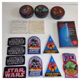 1988 STAR WARS FAN CLUB, "THE FIRST 10 YEARS", PURPLE, BLUE, WHITE, BLACK, YELLOW THREAD STAR WARS THINKING CAP CO, EMPIRE PATCH, BLACK BACKGROUND, RED "STAR WARS" WHITE "ESB" STAR WARS A NEW HOPE, 4X6 TRIANGLE BLUE/BLACK BACKGROUND W/ ORANGE, YELLOW, BLACK, AND WHITE THREAD STAR WARS MAY THE FORCE BE WITH YOU STAR WARS STAR WARS DARTH VADAR (SIC) LIVES STAR WARS BROTHERHOOD OF JEDI KNIGHTS STAR WARS, WHITE THREAD ON BLACK BACKGROUND STAR TREK PHASER STAR TREK, 9 DIFFERENT, INCLUDING URP, NCC 1707, LIVE LONG SIGN, ETC. INDIANA JONES:RAIDERS OF THE LOST ARK EMBROIDERED PATCH "RAIDERS OF THE LOST ARK" JEDI EMBROIDERED PATCH RETURN WITH YODA (2) STARWARS EMBROIDERED PATCH "A NEW HOPE" ESB EMPROIDERED PATCH, VADER IN FLAMES ESB EMBROIDERED PATCH "THE EMPIRE STRIKES BACK"