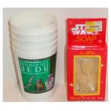 1982 DEKA JEDI 3-PIECE PLACE SETTING, WICKET THE EWOK 1983 DEKA PLASTICS 11 OZ TUMBLER 1983 DEKA PLASTICS 6 OZ TUMBLER 1982 DEKA PLASTICS 6" CEREAL BOWL 1982 ICARUS CO JEDI PLASTIC PLACEMATS, LANDO/CHEWIE/HAN, BRITISH MANUFACTURE 1982 ICARUS CO JEDI PLASTIC PLACEMATS, R2-D2/C-3PO, BRITISH MANUFACTURE 1983 DEKA PLASTICS 20 OZ SOUP BOWL 1980 DEKA COFFEE MUG WITH HANDLE, LEIA AND EWOKS, DARTH AND ROYAL GUARD, LUKE AND YODA 1982 DEKA 3-COMPARTMENT PLATE 1990 BETRAS PLASTICS, THE SIMPSONS SPORT BOTTLE 1980 DIXIE LAMINATED PHOTO PLACEMATS, 4 DIFFERENT ESB SCENES, MAIN-IN OFFER FROM DIXIE 1983 COCA-COLA JEDI PLASTIC DRINKS PITCHER, VARIOUS CHARACTERS 1991 PARAMOUNT STAR TREK 25 TH ANNIV 32 OZ DRINK TUMBLERS, TV SERIES AND MOVIES 1989 APPLAUSE BACK TO THE FUTUE INSULATTED TUMBLER WITH GLITTER, BTF LOGO