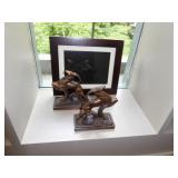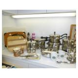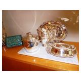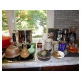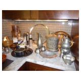 ANTIQUES & COLLECTIBLES •2 VINTAGE/ANTIQUE JAPANESE CARVED WOOD WALL CLOCKS BY SEIKOSHA & AICHITOKEI •COLLECTION OF ANTIQUE & ART DECO BOOKENDS •SILVER & SILVERPLATE •2 CARL SORENSEN VERDIGRIS BRONZE BOWLS W/ DUCK ON LID •PAIR HEINTZ STERLING ON BRONZE PLATES •COLLECTION OF BRASS CANDLESTICKS •PEWTER COFFEE AND TEA SERVICE W/ TRAY •ANTIQUE CERAMIC TANKARD W/ PEWTER TOP •OGGI COPPER BAR MUGS •BRONZE MYSTERY BANK •STATUE OF BRONZE BOY ON QUARTZ ROCK •BARWARE •TOYS