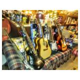Guitars by Ibanez, Yamaha, Harmony, Sekova, Galveston, First Act, Spectrum, and many more! Well Over 15 guitars to choose from! Global Amplifier, Tamboure by Dexton Drums, King by H.N. White Corp 221455 Trumpet, Bandmaster Clarinet, 1894 Mandolin, Bongos, Toy Violins