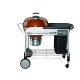 Get the same high-performance kettle BBQ grill that is synonymous with the Weber name, now outfitted with a heavy duty steel cart, push-button ignition system, side table, charcoal bin and LCD timer. The Weber Performer Deluxe 22 in. charcoal grill in copper also boasts the Tuck-Away lid holder that acts as a pair of extra hands to cradle the lid while you tend to the main course. The cooking platform is a 363 sq. in. Gourmet BBQ System hinged cooking grate with a removable center section that accommodates separately-sold Weber cooking components. After you've feasted on a finger-licking meal, simply pivot the three damper blades in the kettle basin to funnel charcoal dust into the removable ash catcher underneath. • Gourmet BBQ system hinged plated steel cooking grate has a 363 sq. in. cooking area, compatible with other BBQ system separately-sold cookware (wok, griddle, sear grate, pizza stone) • Includes electronic touch-n-go gas ignition system; uses separately-sold 14.1 oz. or 16.4 oz. disposable liquid propane canisters • Steel cart frame includes: 1 char-bin weather-protected charcoal container, 1 removable LCD timer, 3 tool hooks, 1 wire bottom rack, 1 painted metal side table, 2 locking caster wheels and 2 all-weather 8 in. rubber-molded wheels • Portable backlit LCD cook timer displays countdown time; take it with you or secure it to the grill cart • Copper performer deluxe 22 in. kettle and lid constructed with high-grade porcelain-enamel • Includes 2-touch cleaning system with 3 aluminized steel rust-resistant dampers, which regulate airflow while cooking and sweep ash after grilling • Includes large-capacity removable ash catcher to easily dispose of coal ashes • Lid has a handle with heat shield, built-in thermometer and adjustable damper with 4 air vents • Includes: 2 char-basket charcoal holders for indirect heat grilling, 1 tuck away lid holder and 1 steel charcoal grate.