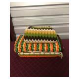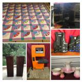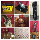You can find details for ALL our online auctions and estate sales HERE Featured in the sale are: Electronics, Glassware, Quilts, & More - Bidding Ends 10/7 @ 7PM CST Some of the specific items that you will find in this sale are: · Hall's Jewel Kitchenware - Beautiful set of 3 Hall's Superior kitchenware bowls in Jewel pattern. All are in good used condition, with minor fading of the gold colored ring on tops of each bowl, and a crack on bottom of the largest bowl. All bowls are in usable condition. · Vintage Pyrex Mixing Bowls - Pyrex ovenware nesting mixing bowls, set of 4. In great condition with no chips or cracks. Some scratches and rubbing consistent with age and use. Not all scratches/rubbing pictured, but some photos for reference. Great usable set for the kitchen! · Vintage Pyrex Mixing Bowls #2 - Pyrex nesting mixing bowls, set of 4. All are in great usable condition with no chips or cracks. Some scratching and rubbing consistent with age and use. Not all scratches/rubbing pictured but some photos for reference. Great set! · Depression Glass Red and Amber - A beautiful lot of red and amber depression glass. There are no chips, but normal signs of wear, such as fading of the red glass. A pretty set of vintage glass to adorn your living space. · Depression Glass Pink, Green, Cranberry and Blue - This is a wonderful lot of depression glass, full of color and style! Two cake plates, a pitcher, candy dishes, and a small coaster. There are no chips or cracks, just a few normal signs of wear including scratches and fading. · Pressed Glass and Glass Assortment - This is a wonderful lot of various pressed glass and glass for entertaining! All pieces are in good used condition, without any cracks or chips. Some pieces included are a juicer, coaster caddy, candy dishes, etc. · Antique Jefferson E. Palestine Chamber Pot & Wash Basin - Here is a pink and white antique bedroom set which includes a wash basin, and pitcher, chamber pot, a smaller pitcher, and vase. All items in this set have crazing, and discoloration, as expected with age. The large wash basin has a long crack, as seen in photos. · English Royal Ironstone Pitcher and Bowls made in Germany - Included in this lot is a Royal Ironstone pitcher, made in England. It does have a brown stain on the outside; see photo. Also included are two large bowls, from Germany, which have signs of age and discoloration. No chips or cracks. · Porcelain Flowers - Beautiful porcelain flower stems adorn this feminine lot. Also included is a figurine of a young woman with her dog, and a lidded hand painted jar. These items are in good used condition. · Sony Blu-Ray & Sony Sound Bar - Here's a wonderful lot of Sony home entertainment! Gently used Sony Blu-Ray model no. BDP-S500 and Sony soundbar model no.SA-40SE1. The soundbar is untested and comes without a power cord. Blu-Ray was plugged in and powers on. · Teac Multi Music Player GF-350 - New in opened box, only removed for photographs. This is a Teac multi music player, CD recorder, AM/FM, and turntable - model GF-350. Comes with the remote, batteries, and manual. Very nice! · Teac A-601R Cassette Deck - Teac A-601R stereo cassette deck. Clean used condition. Plugged in and powers on, otherwise untested. · Nike Women's Golf Shoes - Practically new ladies Nike golf shoes, size 8.5. Beautiful, clean condition! Don't miss out on these ladies! · Tommy Armour Ladies Golf Club Set - Tommy Armour Royal Scot ladies golf club set, in great condition! Also included is the golf bag, a few boxes of golf balls, a bag of ball tees - everything to get out to the course to hit some balls around! Also included is a Golf Guard case for all your golfing adventures! · Samsung 55'' TV - Model: UN55D7050XF No notable scratches or damage on base or screen. Untested, power cord not included. · Fostoria "Colony" 48 Pieces - Fostoria "Colony" glassware - a collection of 48 pieces. Some really unique pieces such as the platter with a center handle, or the matching set of double candleholders, or the lovely curved sides on a pretty handled plate! Need I say more? Sweet set with no noted chips or cracks. Salt and pepper shakers are stained, with tarnished lids. Otherwise, everything is in great condition! · New Orleans Prints - New Orleans prints matted and framed, with one print showing it's age with a small tear. The overall size is 19''x15''. Artist names not legible, see photos. · Luxuria Seat Covers - 2 Luxuria genuine sheepskin seat covers, still in original packaging! 1 black & 1 cream colored. Fits high and low seat backs. Very soft! Dry clean only. · Canon Camera, Tripod, Monopod - Canon camera model AF35M II. Also included is a Minette tripod, and a monopod comes with this gently used lot. The camera has not been tested. · Minette Slide Projector and Slide Editor - In very good used condition, Minette slide projector model 717A , and viewer model S-1 are included in this lot. Both items are in original box/ packaging. Both are untested. · Canon Super 8 - Canon Super 8 Auto Zoom 814, in gently used condition. This video camera comes with the original case and user's manual. Camera is untested. · Ricoh Triscope 8mm Film Projector - Ricoh Trioscope 8mm film projector in original box with instructions. This item appears to have never been used and is untested. · Panasonic VCR, Samsung DVD - Enjoy family entertainment with this Samsung DVD-HD850, and Panasonic VCR PV-4511. Both items are complete with necessary power cords, instruction, and original boxes. Verified that both power on. · Royal Portable Typewriter - Royal portable typewriter with original case. Condition appears to be gently used. Untested. · Goodyear 12 Volt Air Inflator - This Goodyear inflator comes with original box, appears to have never been used. It has 18 feet of air hose, and glow-in-the-dark pressure gauge. · Black & Decker Drill Powered Band Saw - Black & Decker model no. 74-480 drill powered band saw appears to be in g
