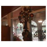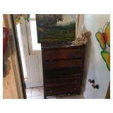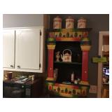 Brightly colored carved display shelf from Mexico. Two piece contemporary walnut and glass display cabinet.