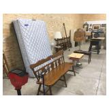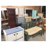 Furniture: Dressers, Bookshelves, Parlor Tables, Table Lamps, Floor Lamps, End Tables, Coffee Tables, Night Stands, Twin and Full Beds, Cedar Chests, Several 4 Drawer File Cabinets, Cast Iron Fireplace Mantel, Primitive Table, Wingback Chair, 11ft Oak Church Pew, Corner Curio, Drop Leaf Table/Chairs, Oak Curio Secretary, 6ft Bench.