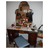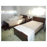 Bedroom furniture including antique twin beds, antique vanity with large mirror, chests of drawers